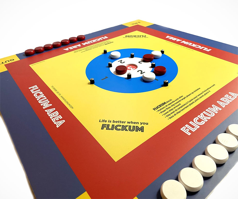 Flicking your disc into the center hole for maximum drinking and points is the main object of the game. Accuracy, strategy, and teamwork are of utmost importance as you and your partner attempt to become Flickum champions and bury your opponent.